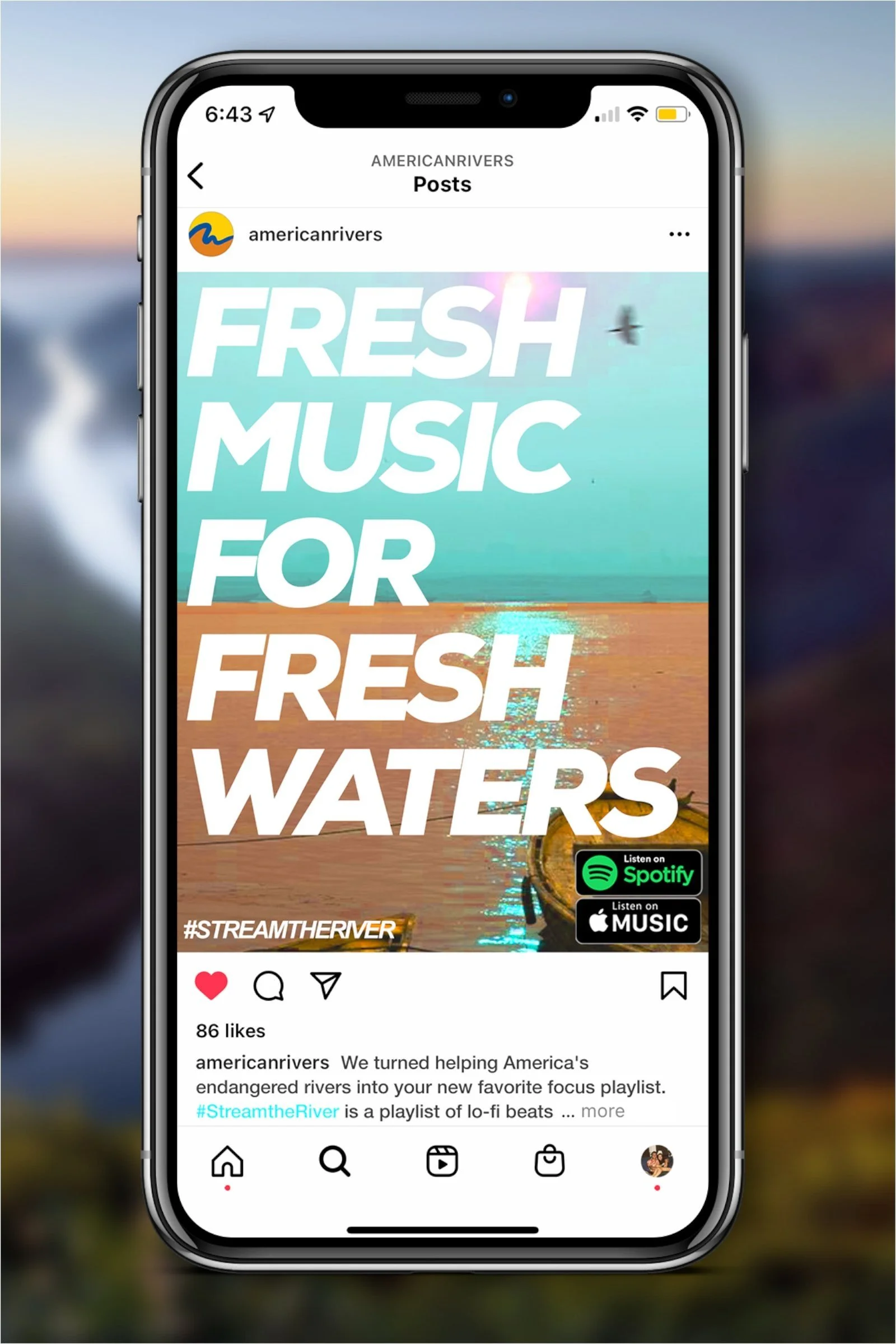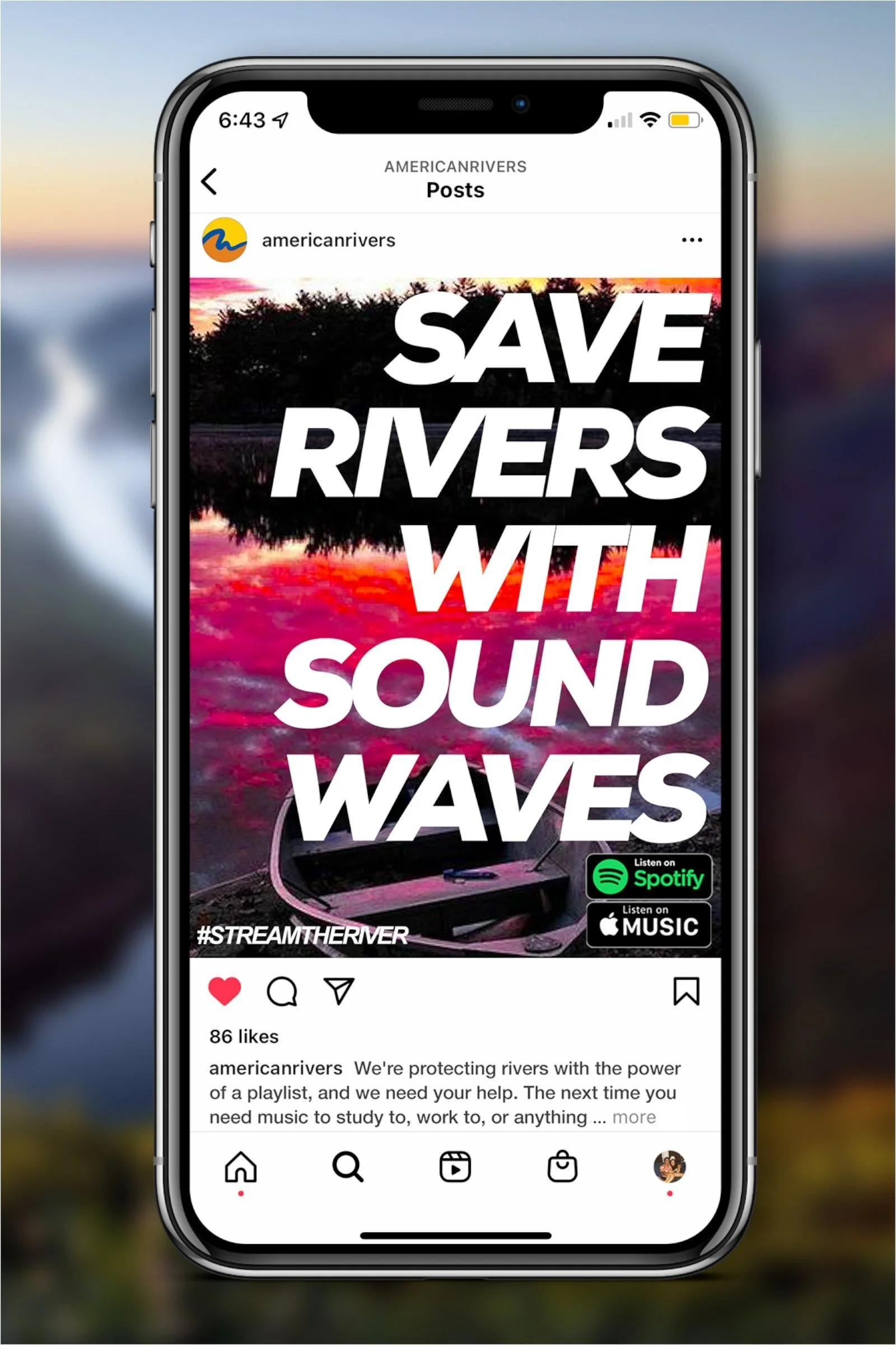 “We're protecting rivers with the power of a playlist, and we need your help. The next time you need music to study to, work to, or anything-else-to, put on the American Rivers #StreamtheRiver playlist on Spotify or Apple Music. Every listen is a donation, which means your streams flow right back to our rivers. So grab some headphones and #StreamtheRiver”